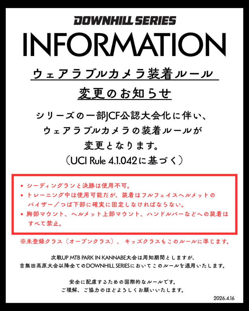 吉無田高原大会以降全てのDOWNHILL SERIESにおいてこのルールが適用されます。